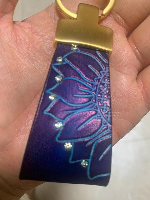 FREE SHIPHandcrafted Leather Keychain – Lotus Flower Design, Purple Blue Gradient, Gold T