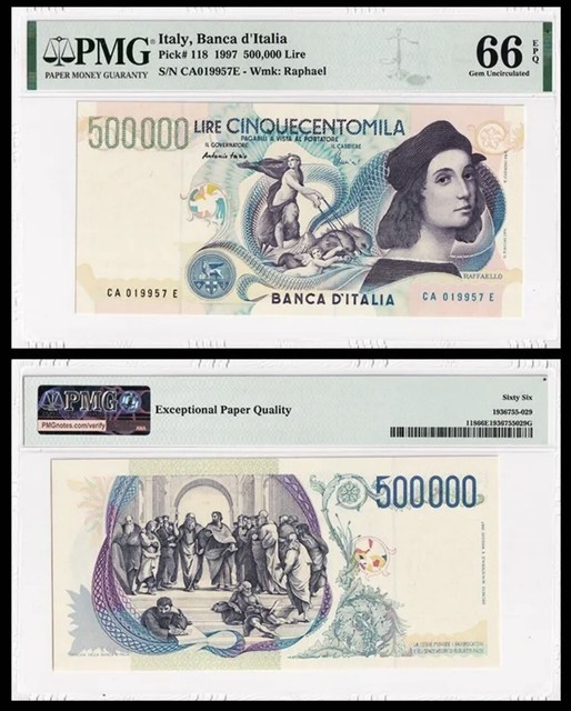 FREE SHIP500,000 Lire 1997 Italy, P# 118 PMG 66 EPQ Gem