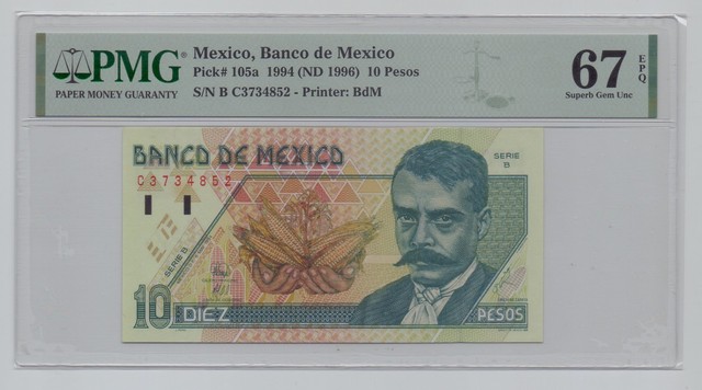 Mexico, 1994(ND 1996), 10 Pesos – PMG 67 See instructions
