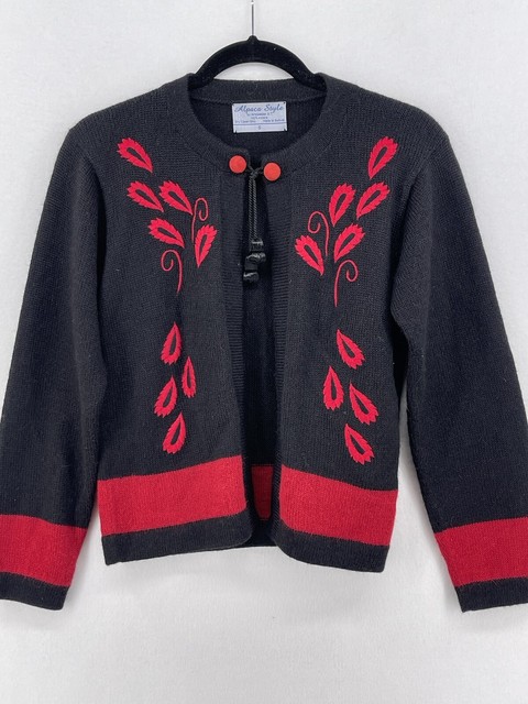 Women's Alpaca Style Sweater Cardigan Black Red Tie Collar Bolivia Soft Small